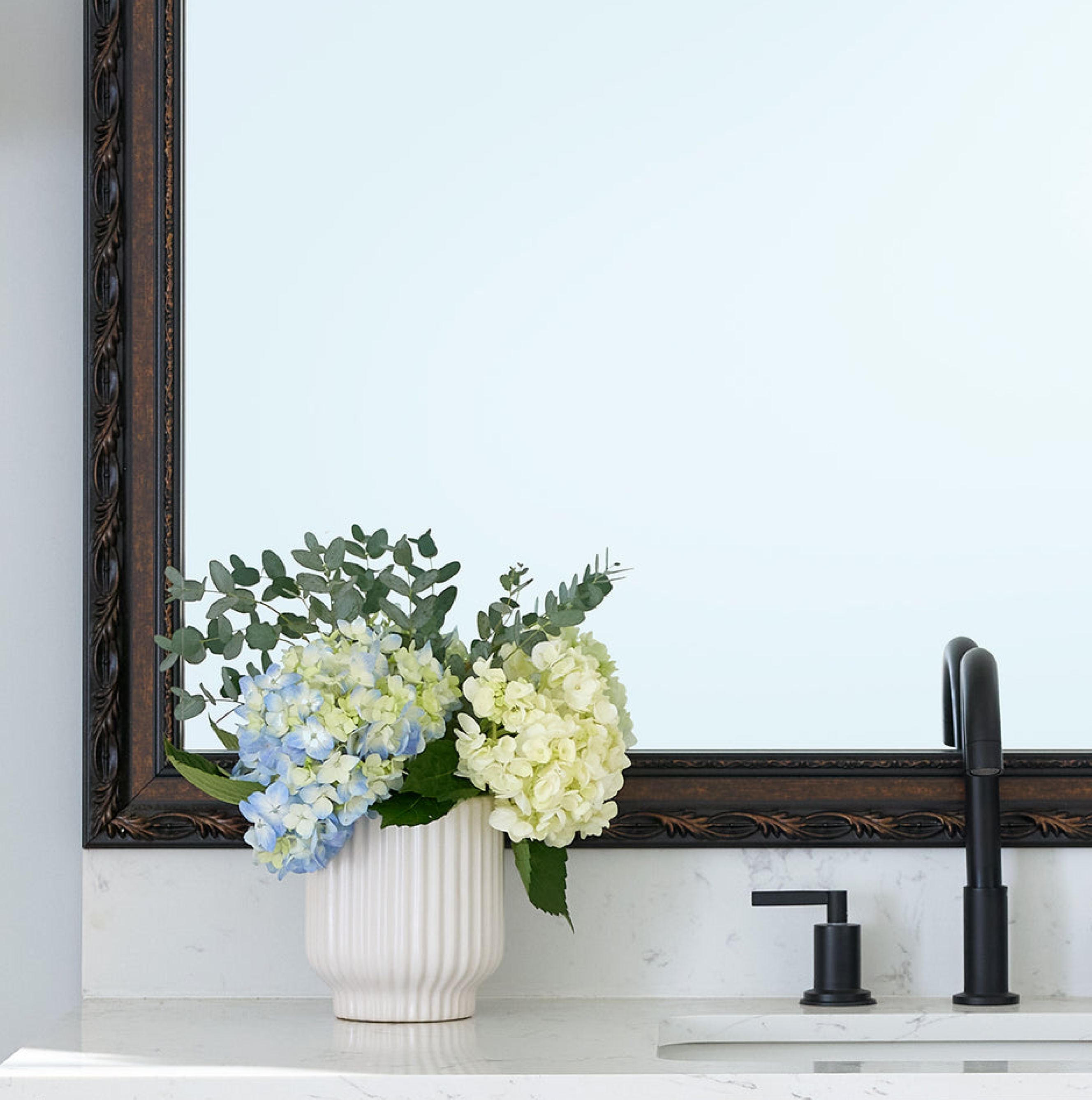 Our frames are compatible with most plate glass mirrors, including those that rest on a backsplash or abut a wall. They attach directly to the glass without needing space around the mirror and are even designed to conceal any existing clips and channels.