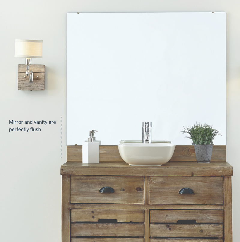 MirrorMate frames are compatible with most plate glass mirrors, including those that rest on a backsplash or abut a wall. They attach directly to the glass without needing space around the mirror and are even designed to conceal any existing clips and channels.