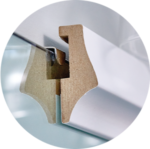 All frames are made of MDF: an environmentally-responsible, strong, non-warping wood-base. They are then finished with a moisture-impervious decorative wrap and seal. If for any reason your frame warps we’ll replace it! We also use an industrial grade adhesive so you can be sure your frame won’t fall off your mirror.