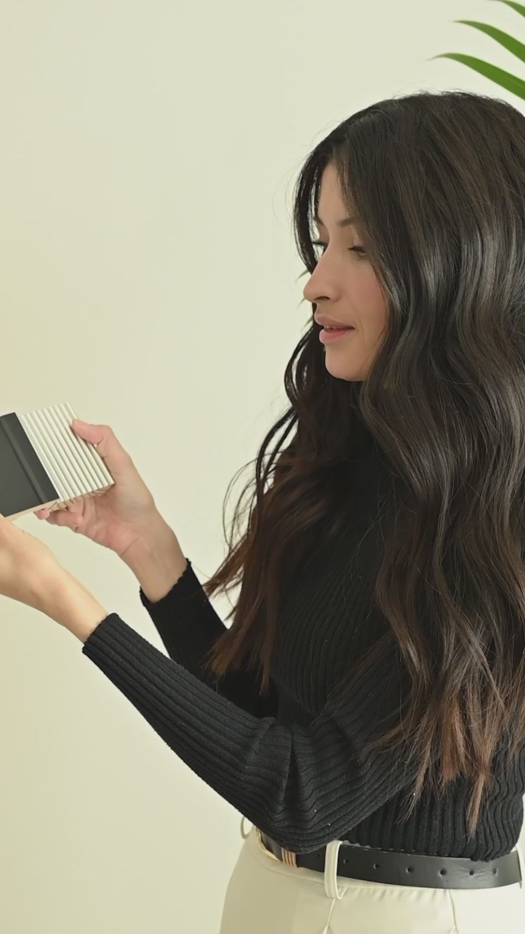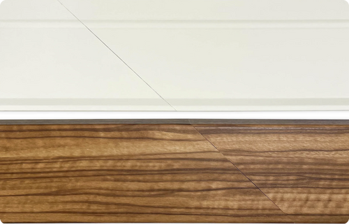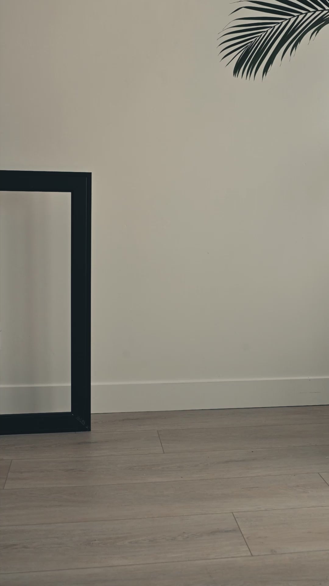 Take the frame down and peel off the frame’s tape backing. Without touching the frame to the mirror, guide the frame into place using the placement corner blocks. Starting at the top edge, firmly press the frame to your mirror. Run your hand around all edges of the frame to secure it in place.