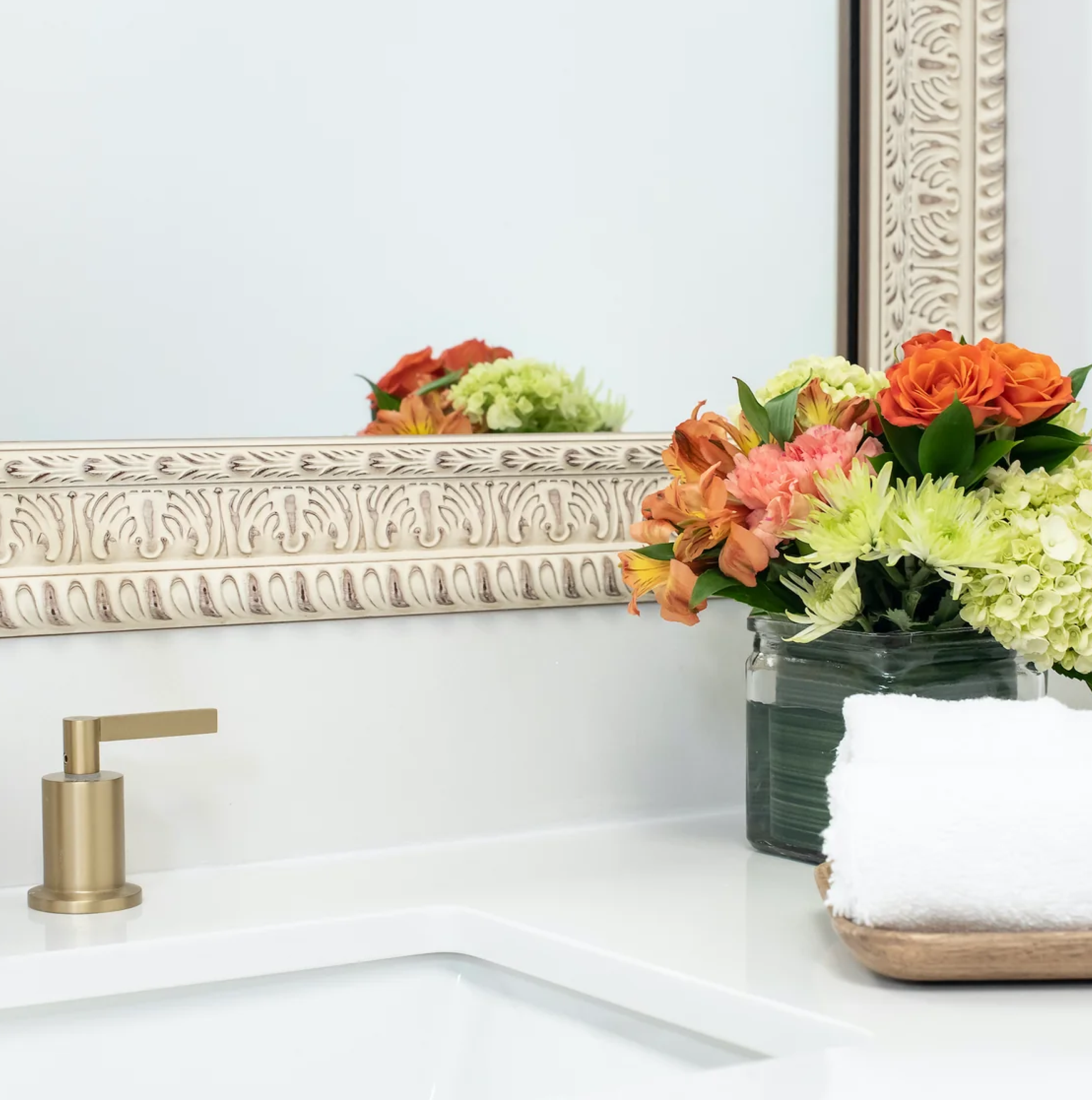 Our frames are compatible with most plate glass mirrors, including those that rest on a backsplash or abut a wall. They attach directly to the glass without needing space around the mirror and are even designed to conceal any existing clips and channels.