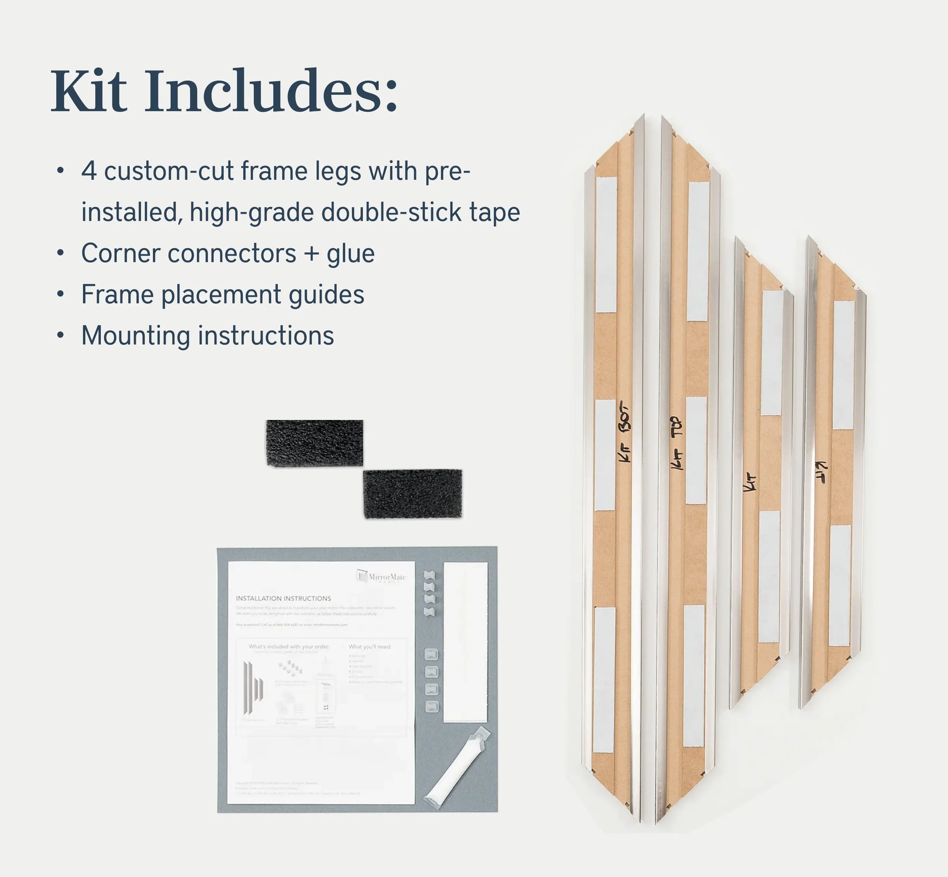 MirrorMate frames are compatible with most plate glass mirrors, including those that rest on a backsplash or abut a wall. They attach directly to the glass without needing space around the mirror and are even designed to conceal any existing clips and channels.