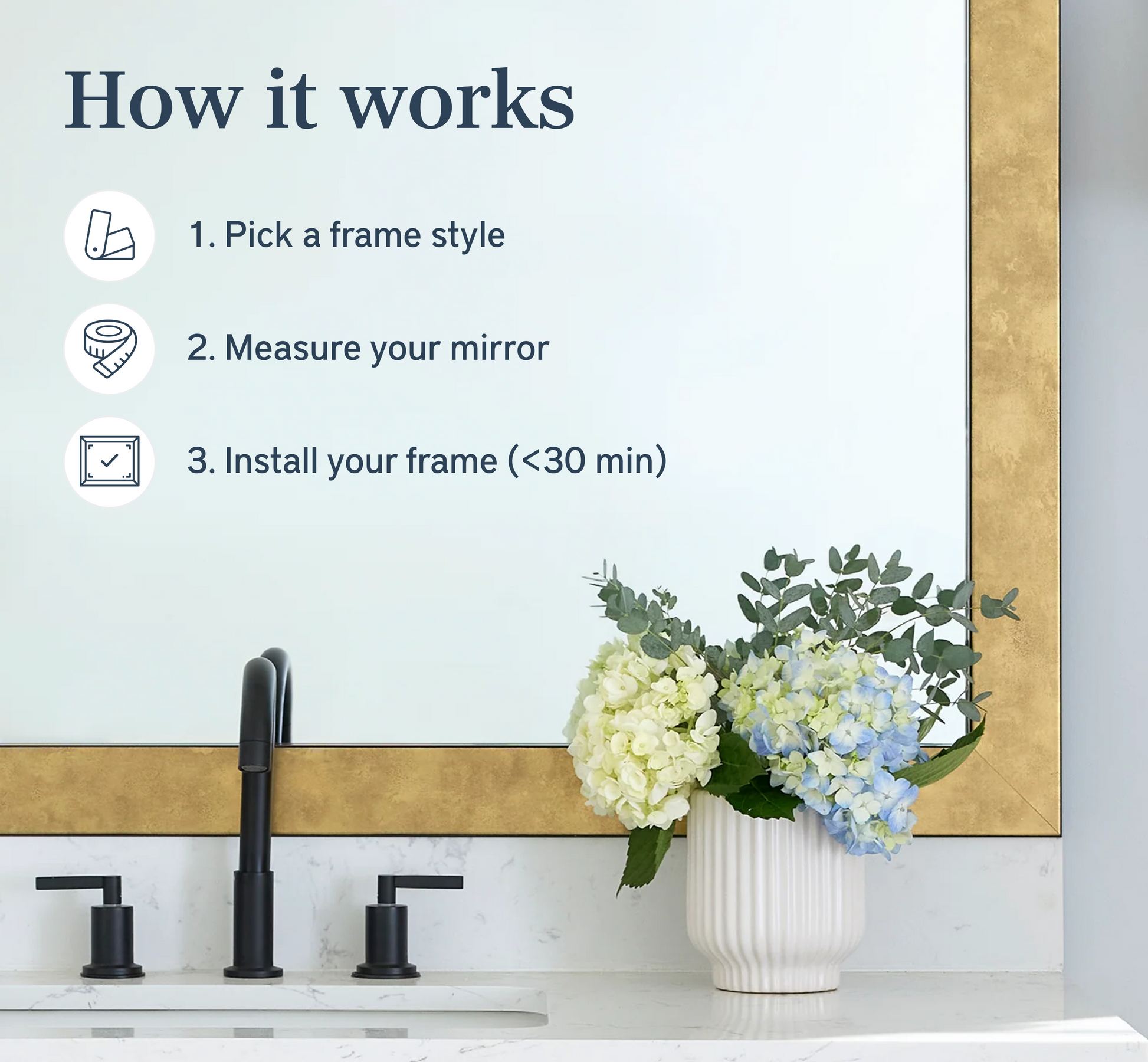 The perfect facelift for new construction, dated, or decaying bathroom mirrors.