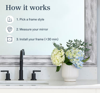 The perfect facelift for new construction, dated, or decaying bathroom mirrors.